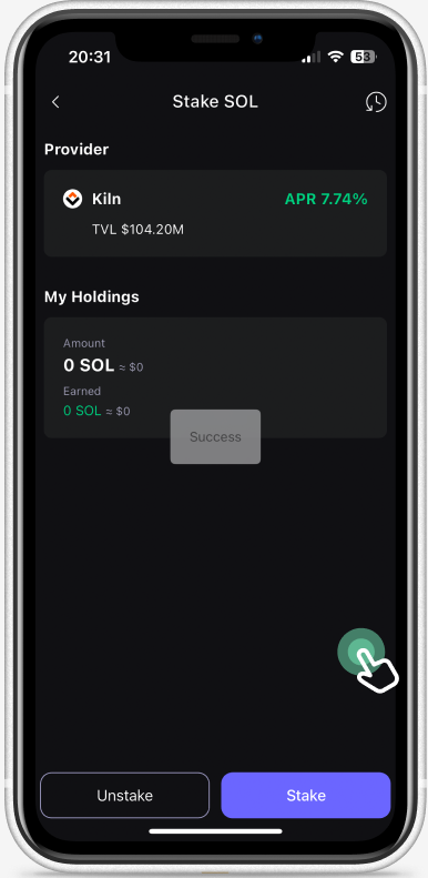 Staking SOL with Kiln through SafePal wallet provides a convenient way to earn passive income while contributing to the Solana network's security. By following this guide, you've successfully put your SOL to work and can now monitor your growing rewards directly within your SafePal wallet interface.Remember that cryptocurrency investments carry risk, and APY rates may fluctuate based on network conditions. Always do your own research before making financial decisions.