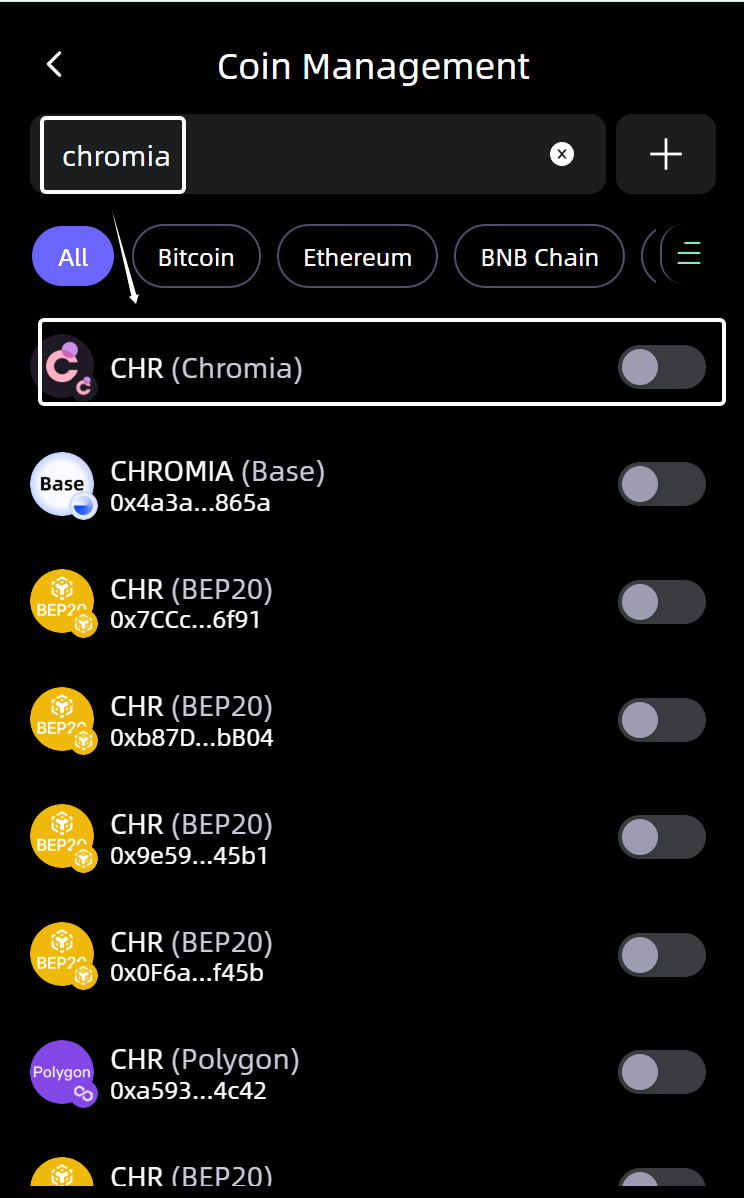 Select the coin that you’d like to add, which is $CHR(Chromia) and click the ‘+’ button.