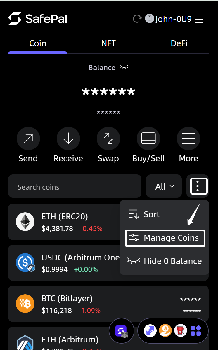 Launch your SafePal Extension Wallet, click the icon with the three dots, then click ‘Manage Coins’ on the Extension Wallet homepage.