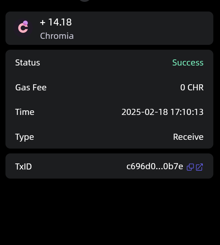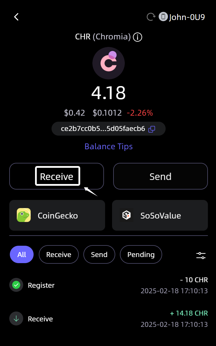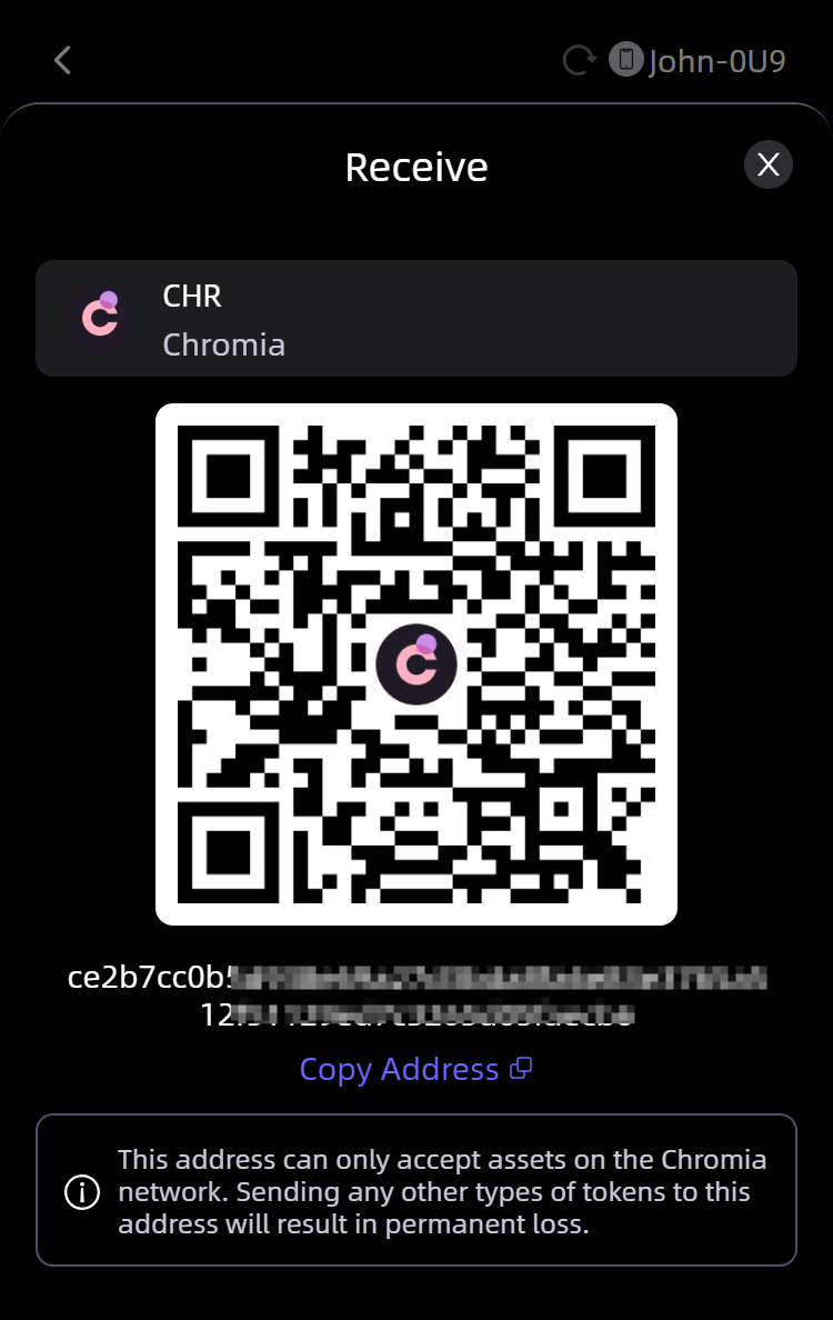 Copy or share the wallet address with your friends, and start receiving the $CHR(Chromia) coins using the address!