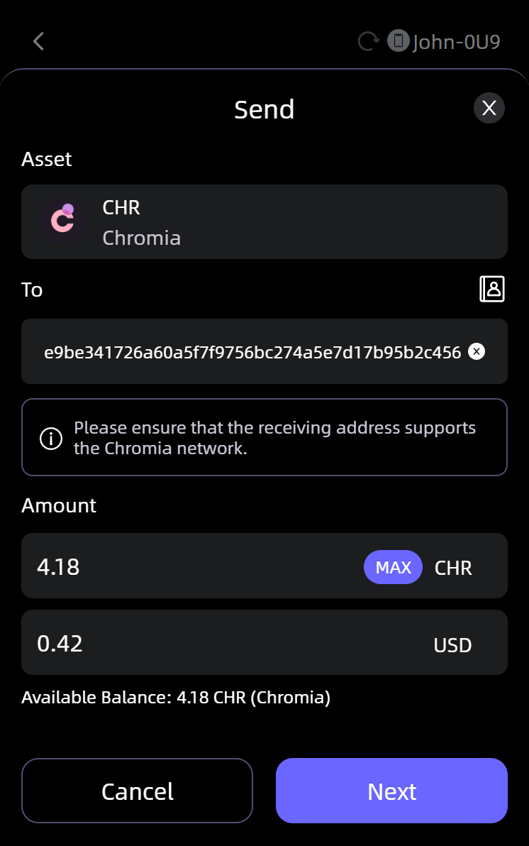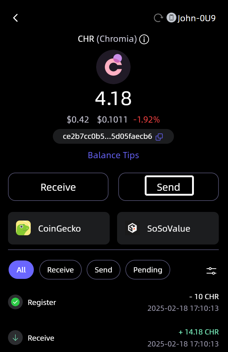 Gently click on the coin that you want to send out, here is $CHR(Chromia), tap the Send icon.