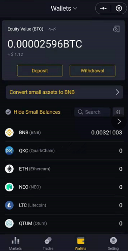 Step 1 Log in to the Binance DApp, and go to the 'Wallets' tab
