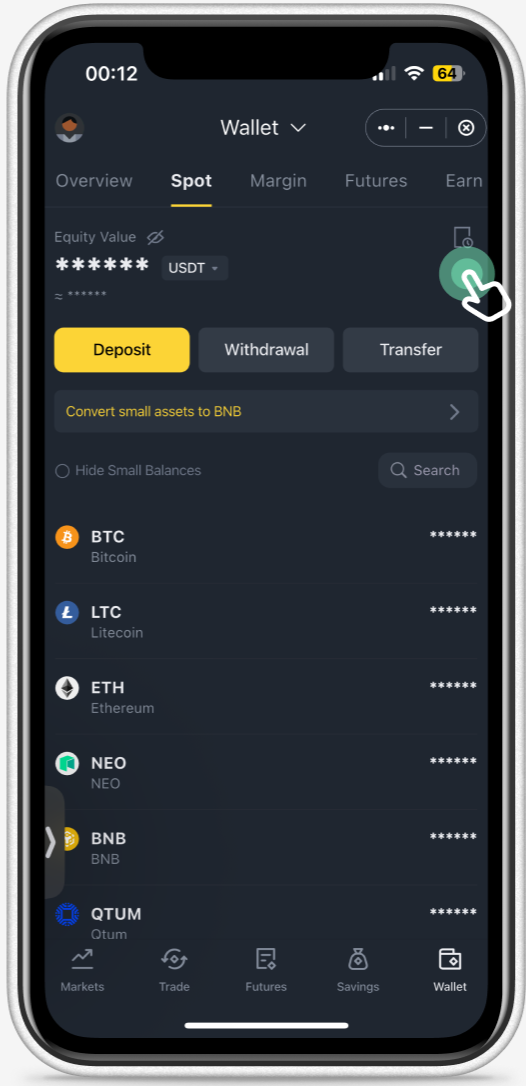 1. Go to the 'Wallets' tab and click the history icon at the right upper corner.