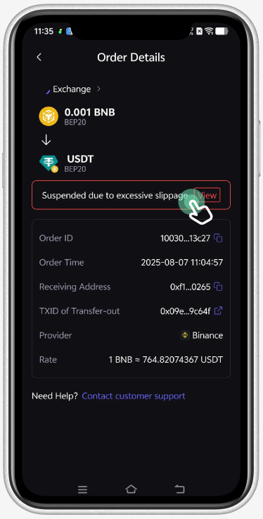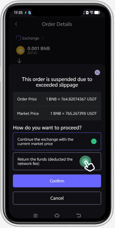 On the order detail page, the details of the stuck order are displayed. There will be two options for a stuck Swap order: 1) continue to exchange with the updated exchange rate, or 2) cancel the order.