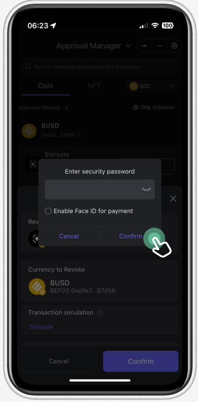 3. Since revoking the token access is a on-chain process, the action will be broadcast onto the blockchain and there is a blockchain gas fee charged from your wallet by signing the revoke request. Enter your App password and tap Confirm to proceed with next steps.