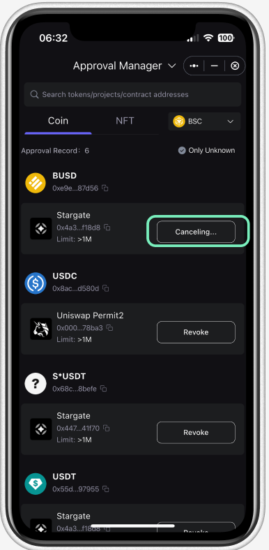 The Stargate will not have access to the $BUSD token in your SafePal wallet then, which means the DApp is revoked for your token and it has no access to your wallet $BUSD balance anymore.