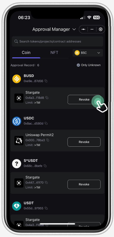 1. On this page, you can view the full token list of authorized DApps on different chains. Switch between different chains and select the token that you want to revoke. Here we will use the $BUSD token on Stargate as an example.