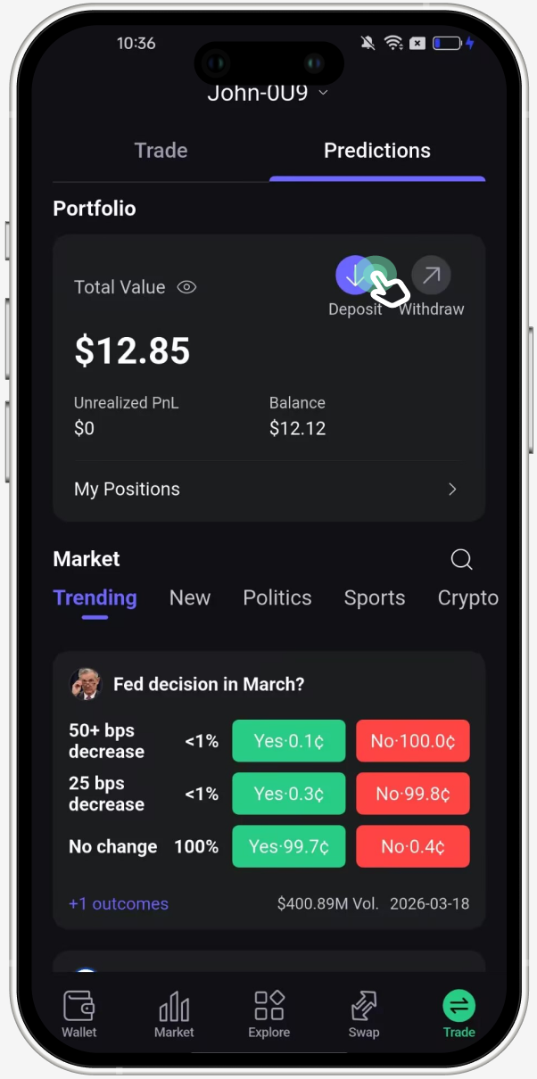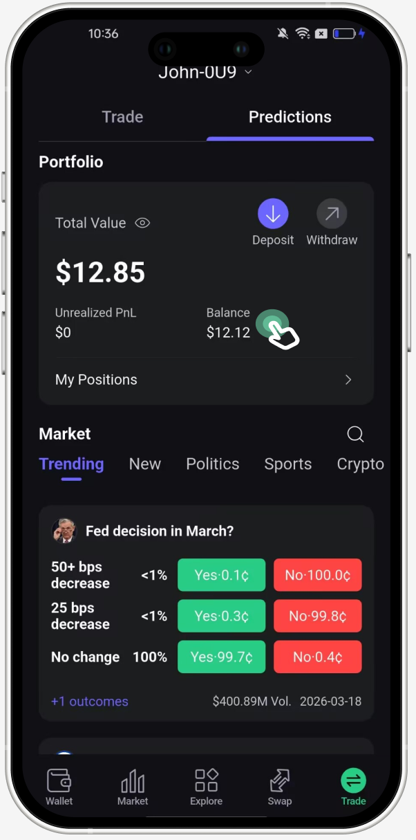 Return to Polymarket in the Trade section and refresh the page to check your balance in the Portfolio section.