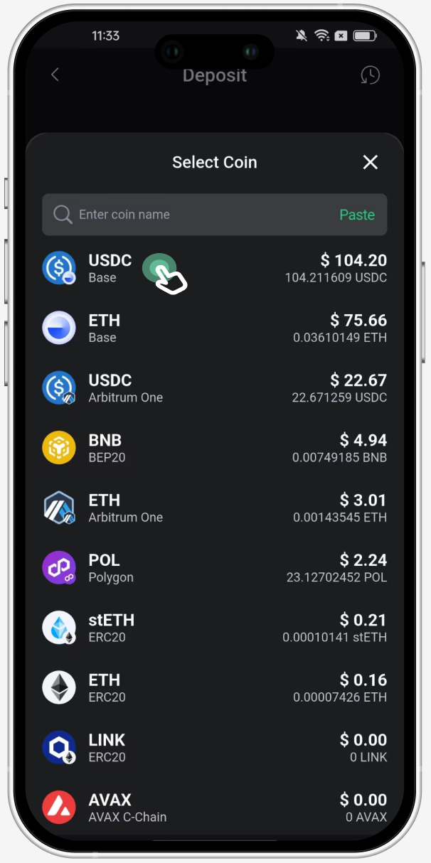 Select to choose the coins and network for your deposit, here we will deposit $USDC on the Base network.