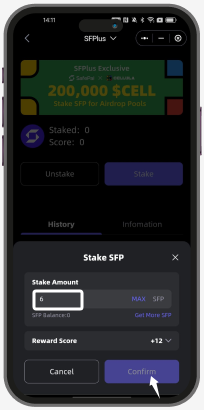 Félicitations ! Vous avez staké avec succès des actifs cryptographiques $SFP dans SFPlus. Sur la même page, vous pouvez voir tous les détails du staking et des scores !
