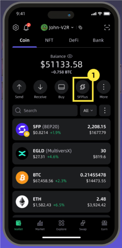 Lancez votre application SafePal et cliquez sur l'icône 'SFPlus' dans le magasin DApp de votre portefeuille SafePal. Vous pouvez également rechercher SFPlus pour trouver l'onglet DApp dans notre magasin DApp.
