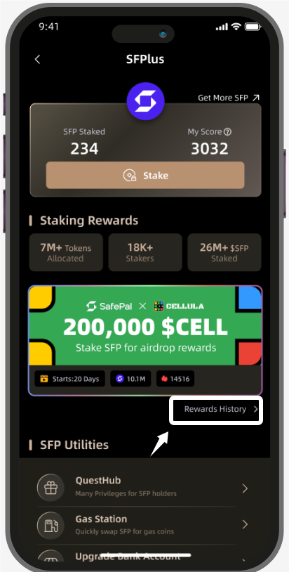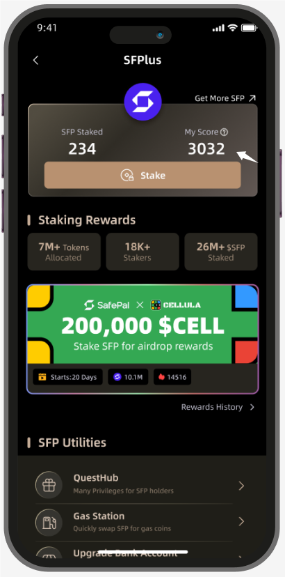 SFPlus est une nouvelle fonctionnalité lancée par SafePal qui permettra aux stakers de SFP de bénéficier de certains privilèges, par exemple, les utilisateurs peuvent staker $SFP pour obtenir les récompenses potentielles d'airdrop avec le portefeuille SafePal. Vous pouvez staker ou unstaker presque à tout moment, ce qui vous permet de conserver la flexibilité et la liquidité de vos actifs $SFP. Dans cette section, nous allons vous montrer comment vérifier votre score de staking et les récompenses de staking dans le SFPlus.