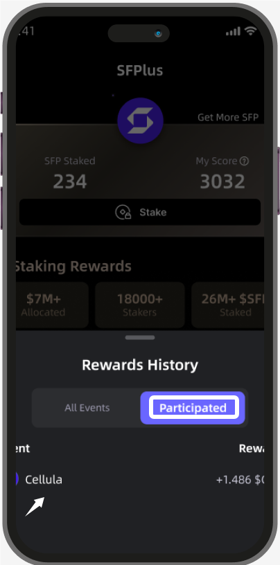 Cliquez sur l'onglet Participé, vous pouvez voir combien de récompenses vous avez obtenues en stakant $SFP dans le SFPlus !