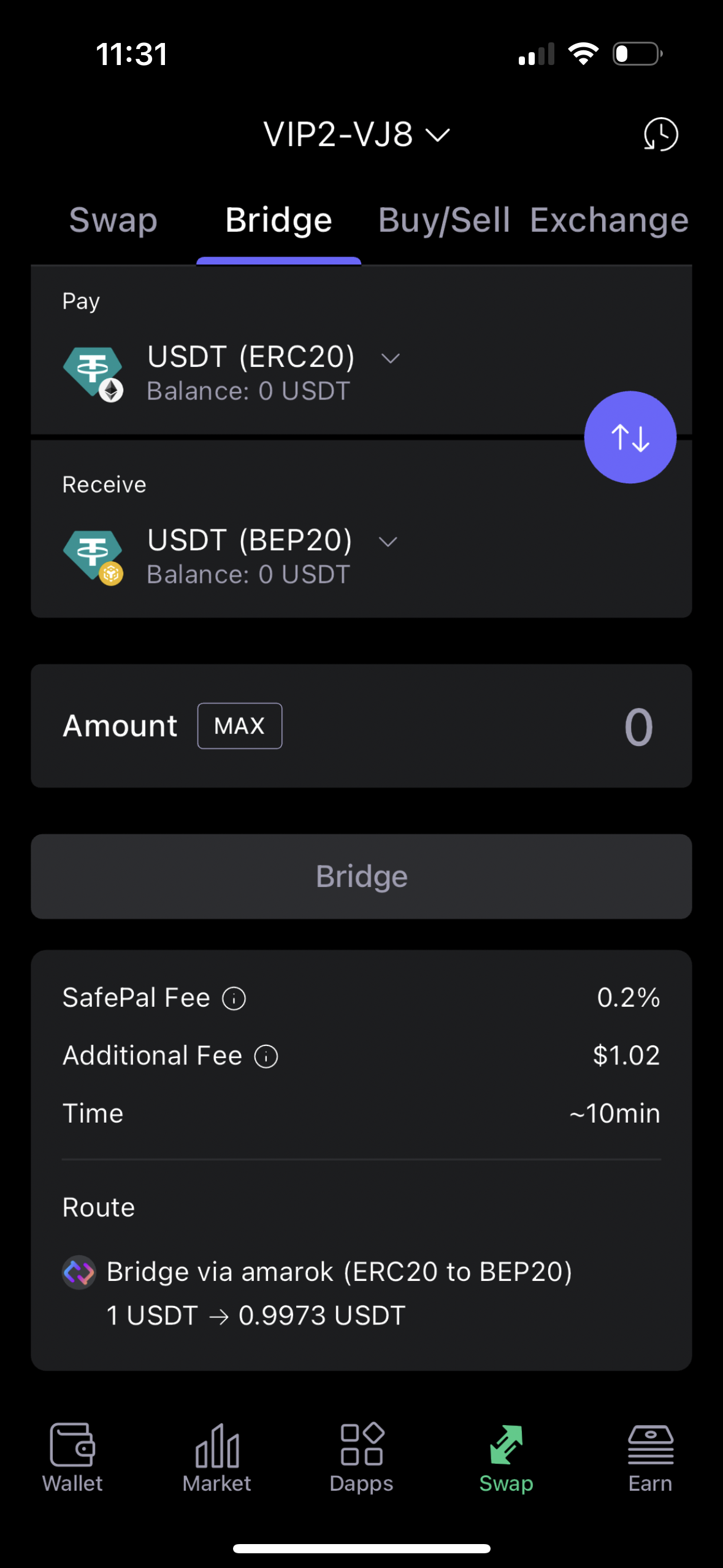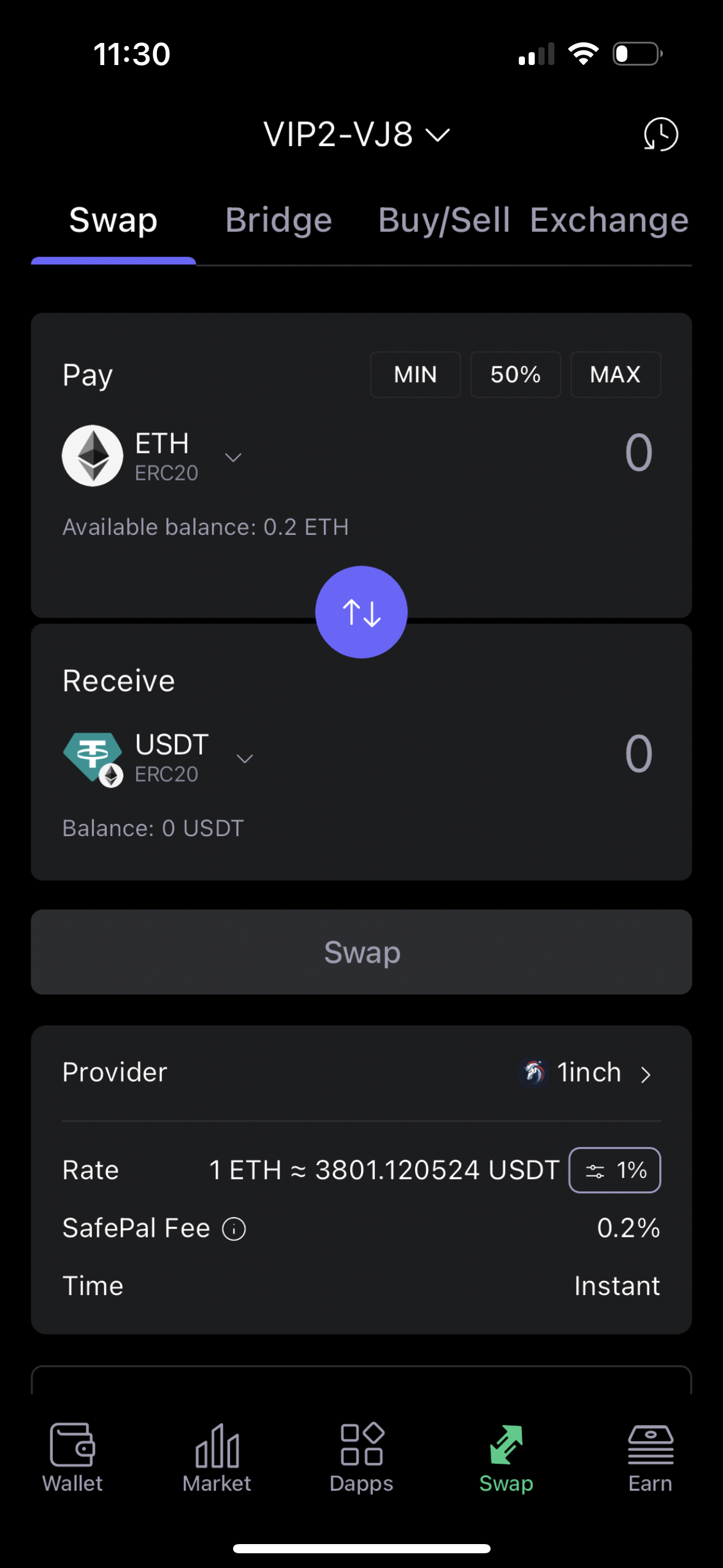 Pour les commandes de Swap et de Bridge, SafePal facture des frais de 0,2% sur chaque commande, à l'exclusion des frais de gaz nécessaires à la blockchain et des frais facturés par les prestataires de services tiers.