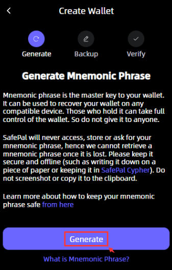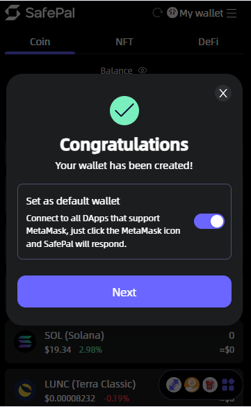 Toutes nos félicitations! Vous avez créé avec succès un portefeuille d'extension SafePal.