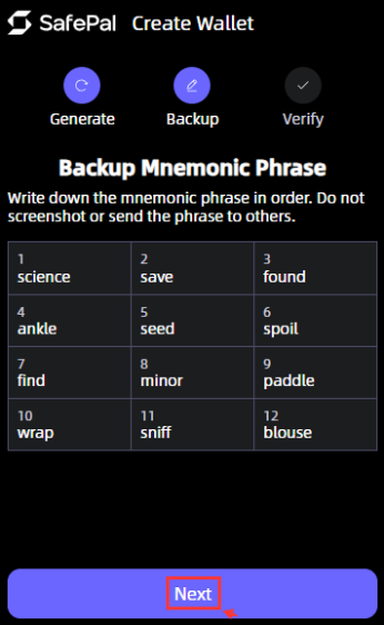Ensuite, veuillez noter et sauvegarder en toute sécurité la phrase mnémonique de votre portefeuille d'extension.