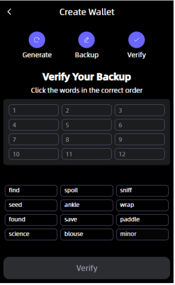 Cliquez sur les mots dans le bon ordre pour vous assurer que vous avez correctement noté votre phrase mnémonique. Cliquez ensuite sur "Suivant"