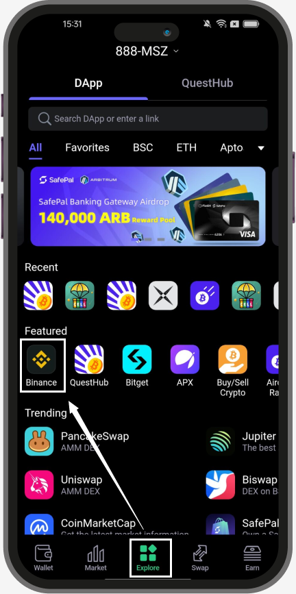 Для торговли в Binance DApp убедитесь, что вы вошли в систему и внесли депозит в DApp. Запустите приложение SafePal и нажмите, чтобы открыть Binance DApp.