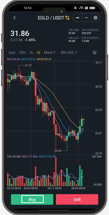 Открыв страницу K-линии EGLD/USDT, вы можете просмотреть K-линию рыночного курса между EGLD и USDT. На этой странице есть две кнопки: Купить и Продать. В этой статье мы используем 'Купить' в качестве примера.