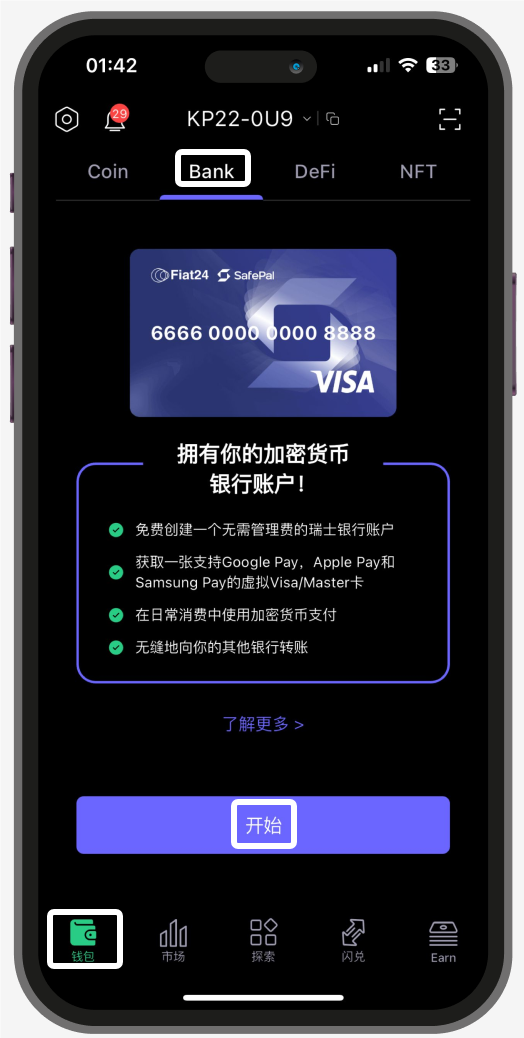 在开始创建银行账户之前,请确认您的钱包中至少有Arbitrum主网上0.0001个的$ETH。这个资产仅用于Fiat24团队验证目的,我们不收取任何费用。打开你的SafePal App,打开钱包里面的“Bank”按钮,点击‘’开始‘’。