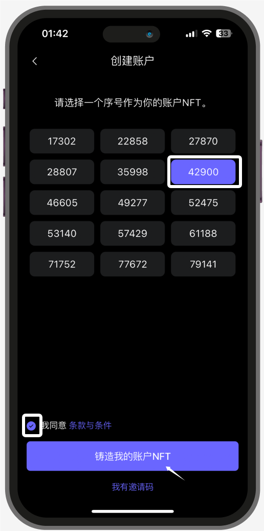 选择一个序号作为您的账户NFT的ID。如果您有推荐码,可以点击 ‘我有推荐码’然后输入您的邀请码。点击“铸造我的账户NFT”,等待Mint过程,通常需要大约 10-20 秒,以完成您的账户创建。