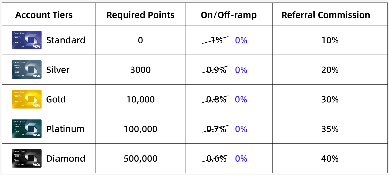 SafePal App内置的银行通道账户目前分成5大等级,从低到高分别是标准账户、白银账户、黄金账户、铂金账户、钻石账户。不同等级的账户解锁的积分等级、对应的费率折扣以及返佣比例均不相同(详见下表)。您可以通过开户、充值、推荐好友、质押SFP等方式积累积分,并解锁对应的账户等级(详见本文第二部分 “积分体系” 的介绍)。