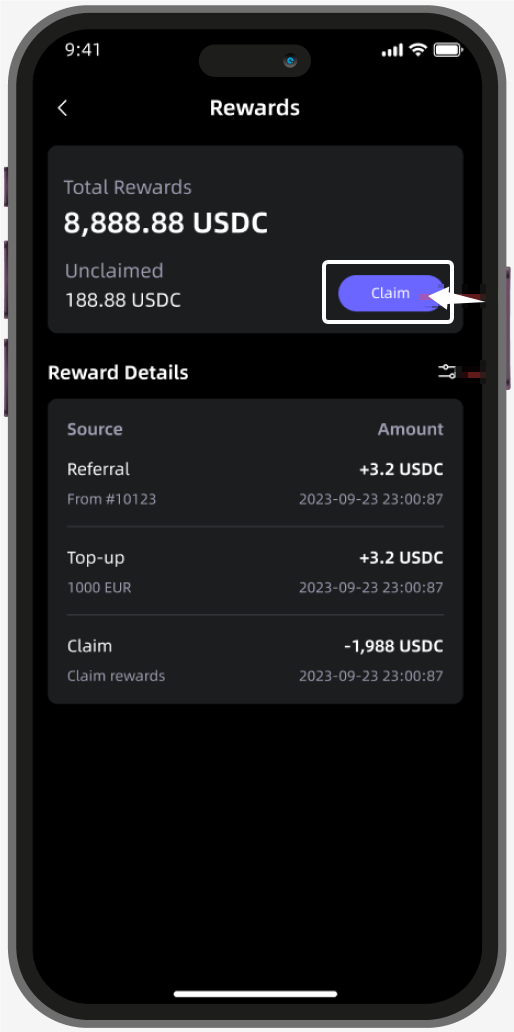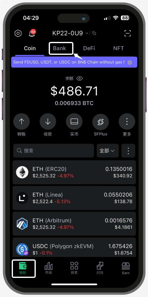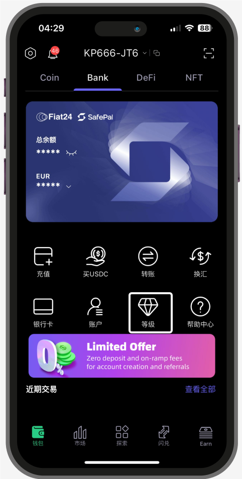 如何查看并提取您的银行账户奖励 2024年11月08日 14:54 更新 感谢您选择SafePal! 本文介绍了如何查看和领取银行账户里面的奖励。 本文包含以下步骤: 步骤 1 进入银行奖励页面 步骤 2 领取奖励 步骤 1 进入银行奖励页面 打开您的 SafePal App,在钱包页面点击“Bank”图标。 点击您银行账户中的“等级”图标。 步骤 2 领取奖励 您可以查看您银行账户的等级和总奖励信息,点击奖励后的“>”图标。 点击“领取”。 点击“确认”,输入您的 SafePal App 密码来授权签名。 当领取成功且交易已广播到区块链后,请到钱包首页的$USDC(Arbitrum)详情页查看余额。 相关文章 SafePal银行通道功能一览 SafePal银行通道服务费率一览 如何在SafePal 银行账户质押SFP来获得账户等级和积分 如何通过SafePal银行通道购买USDC DApp安全相关